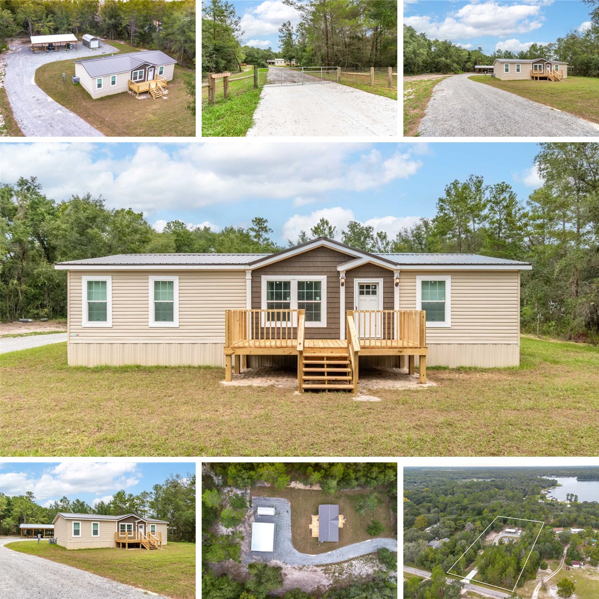 Freshly completed and never occupied, this pristine 2024 manufactured home is ready for its first owner! Fenced and gated on over 3 acres in the peaceful Island Lake Acres community, the property is offered fully furnished with brand-new furnishings throughout, perfect for a seamless move-in or immediate rental opportunity. The 3-bedroom, 2-bath split-bedroom layout offers 1,404 square feet of thoughtfully designed living space. Inside, you’ll find a bright open floor plan that features luxury vinyl flooring, lots of natural light, and modern finishes that combine comfort and style. The kitchen includes an eating nook and comes equipped with stainless steel appliances, a large center island with breakfast bar, and ample cabinet and counter space. A separate laundry area with washer and dryer is also included. Step outside to enjoy expansive outdoor living spaces, including a generous 10 x 32’ rear deck ideal for entertaining, grilling, or simply enjoying the quiet country setting, and an 8 x 18’ front deck perfect for making a first impression. The property's layout is ideal for those seeking room to breathe, create, or expand. A pole barn with water and power service is in place, including multiple electrical outlets, ideal for workshop use, vehicle or equipment storage, or future hobby farming. An additional storage shed also offers water and electrical hookups, making it highly adaptable for a range of uses. Utilities are fully connected, with a private well, septic system, electricity, and high-speed internet access available, and the zoning allows for flexibility with no HOA or deed restrictions to limit your plans. Located within walking distance of Island Lake and Pegram Lake, this property is an ideal option for those looking to spend time on the water. Lake Ocklawaha is also a short drive away, opening up larger options for fishing, boating, and exploration. This home offers a rare mix of modern convenience and rural privacy perfect for full-time living, a seasonal retreat, or even a fully equipped weekend getaway. With ample space, upgraded features, and all the essentials already in place, this is Florida country living at its most comfortable and convenient!