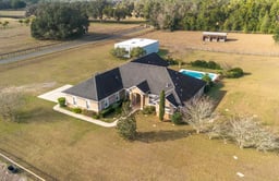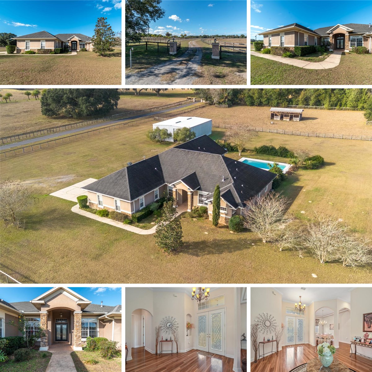 Discover your private slice of equestrian paradise in Ocala’s scenic countryside! Set on 10 acres of clear, open land within Dove Field Farms, this peaceful equestrian estate provides the perfect blend of privacy and flexibility. Fenced and gated, a long drive leads past established pastures towards the home, which features a classic Florida aesthetic, mature landscaping, and a french-door entry. Offering a total of 5-bedrooms and 4-full baths with over 3,500 sq ft of space, the two-story home features a thoughtful split-bedroom floor plan, high ceilings, and lots of natural light throughout. Rich wood-look and tile flooring guide you through expansive living areas, beginning with a formal foyer and dining room dressed in natural light. The heart of the home, a gourmet kitchen, boasts solid wood cabinetry, stone counters, a breakfast bar, and a spacious breakfast nook overlooking the back patios that seamlessly connects to the family room with its cozy fireplace. There are two separate screen-enclosed patios at the back of the home, each overlooking the pool area and providing lovely year-round views of the surrounding farm. Five bedrooms are thoughtfully positioned in a split layout for privacy and flexibility. The spacious primary suite sits on the main level and features two walk-in closets and a spa-inspired en-suite bath with dual vanities, a soaking tub, and an oversized walk-in shower. Secondary bedrooms are set across the house, with a shared Jack-and-Jill bathroom. Upstairs, a private suite enjoys its own private balcony and full bath, providing a full suite experience with stunning farm views. Step outside to your personal resort: a sparkling 32x16’ foot in-ground pool surrounded by a pool deck and privacy landscaping that creates a private oasis for relaxation or entertaining. For horse lovers, the property’s equestrian facilities are ready for use and well-equipped! A 3-stall shed-row barn, a round pen, and multiple paddocks allow for immediate boarding and training. An additional metal workshop is also in-place near the home, offering ample space for equipment and storage, as well as potential conversion for use as additional barn space with a little imagination. Located in the quiet Dove Field Farms community and zoned A-1, this estate offers the peaceful rhythm of rural life while maintaining easy access to Ocala’s major roadways, shopping, and renowned equestrian venues. Whether you're seeking a working farm, a private family retreat, or a blend of both, this property delivers the ideal balance of comfort, beauty, and location!